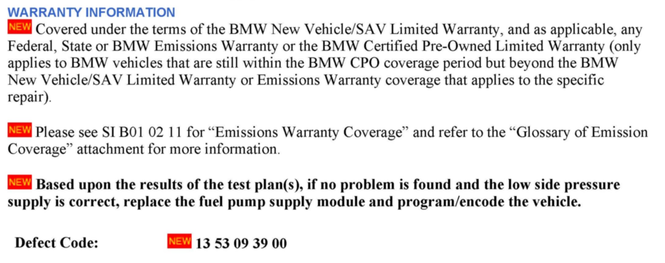[NEW] Covered under the terms of the BMW New Vehicle/SAV Limited Warranty, and as applicable, any Federal, State or BMW Emissions Warranty or the BMW Certified Pre-Owned Limited Warranty (only applies to BMW vehicles that are still within the BMW CPO coverage period but beyond the BMW New Vehicle/SAV Limited Warranty or Emissions Warranty coverage that applies to the specific repair).