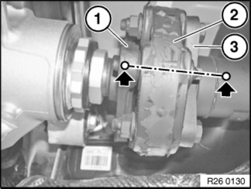 Mark three-hole flange (1), flexible disc (2) and propeller shaft (3) in one plane.