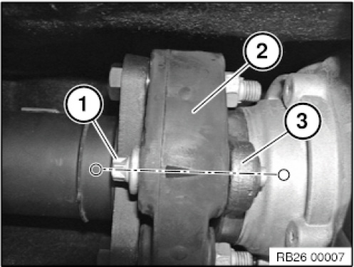 1. The flexible disc connection (1) on the front at the propeller shaft must be marked in one plane with the flexible disc (2) and the three-bolt flange (3) before removal.