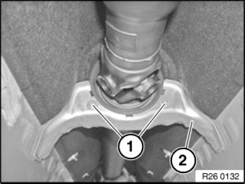 Propeller shaft centre bearing (1) must be installed with the labelling facing upward in transmission tunnel.