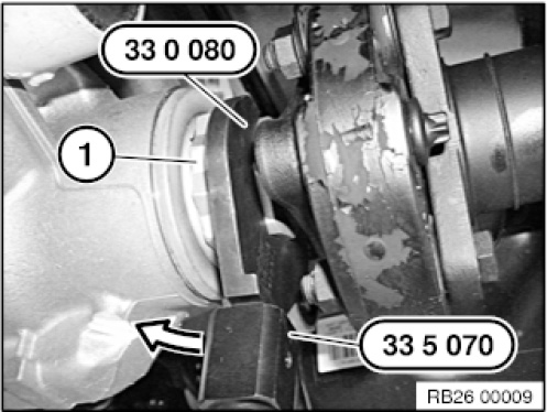 With N53, N54, N55, N57 engines propeller shaft centre bearing (1) is identified with the labelling TOP.
