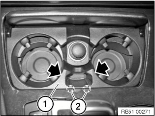 Using the index and middle fingers, pull cupholder insert (1) upward at marked position (arrows) until rear attachment points (2) unlock.