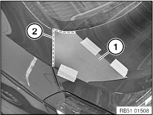 Tape off tailgate in area of rear spoiler (1) with yellow plastic adhesive tape (2).