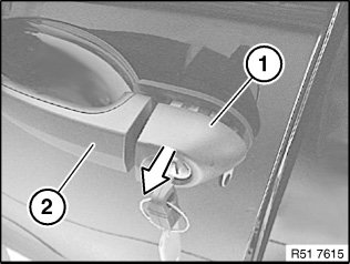 Turn ignition key slightly and pull off cover (1) in direction of arrow with outer door handle (2) opened slightly.