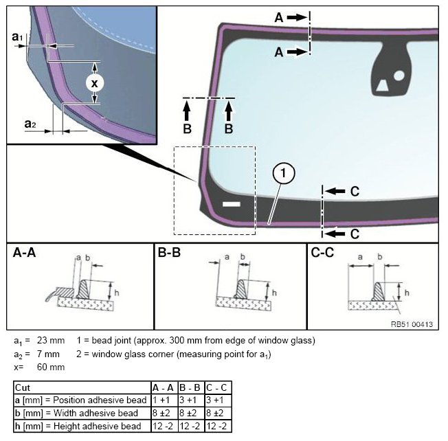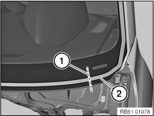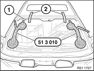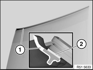 IMPORTANT: Just before the windscreen is installed, press down expanding foam tape (1) using special tool 51 0 300 or reattach expanding foam tape (1). An expanding foam tape (1) that has become relaxed could change the position of the adhesive bead and thereby lead to wind noise or windscreen leaks.