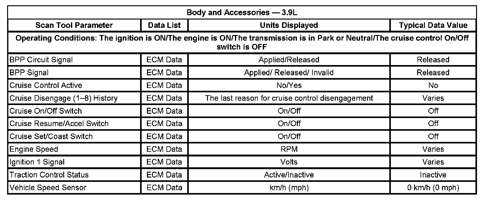 The scan tool data lists contain all of the cruise control related parameters that are available on the scan tool. The parameters in the list are arranged in alphabetical order. The data list column indicates the location of the parameter within the scan tool menu selections.