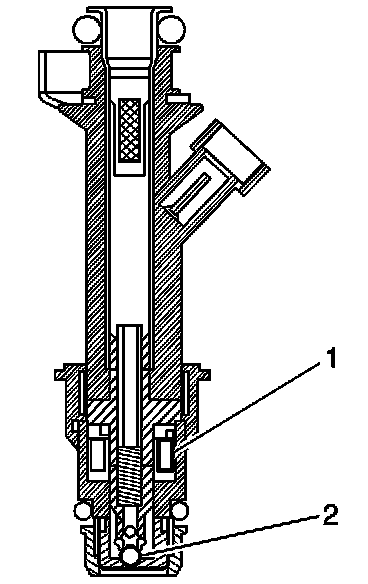 The Mini Multec 3.5 fuel injector assembly is a solenoid operated device, controlled by the engine control module (ECM), that meters pressurized fuel to a single engine cylinder. The ECM energizes the high-impedance (12.0 ohms) injector solenoid (2) to open a normally closed ball valve (3). This allows fuel to flow into the top of the injector, past the ball valve, and through a director plate at the injector outlet. The director plate has four machined holes that control the fuel flow, generating a spray of finely atomized fuel at the injector tip. Fuel from the injector tip is directed at the intake valve, causing it to become further atomized and vaporized before entering the combustion chamber. An injector stuck partly open can cause a loss of pressure after engine shutdown. Consequently, long cranking times would be noticed on some engines.