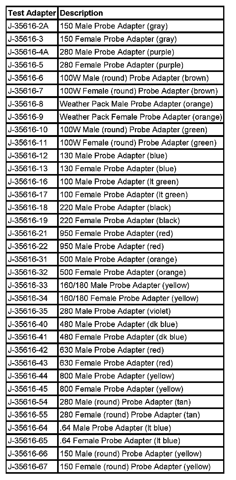 NOTE: Do not insert test equipment probes (DVOM etc.) into any connector or fuse block terminal. The diameter of the test probes will deform most terminals. A deformed terminal will cause a poor connection, which will result in a system failure. Always use the J-35616 GM-Approved Terminal Test Kit or the J 42675 Flat-Wire Probe Adapter in order to front probe terminals. Do not use paper clips or other substitutes to probe terminals.