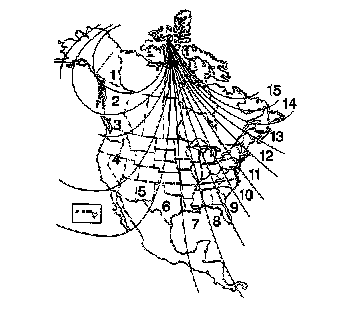 Compass variation is the difference between magnetic north and geographic north. In some areas of the country the difference is great enough to cause the compass to give a false reading. If this occurs, the compass variance must be set. View the variance zone map to determine the correct zone. The zones are numbered 1 through 15. While the DIC is in the COMPASS ZONE item, the DIC will display the current compass zone. Depressing the Set/Reset button will scroll through the available compass zones. Depressing the Set/Reset button for a few seconds will select the displayed compass zone.