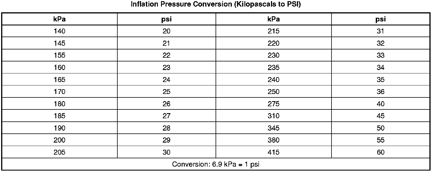 One pound per square inch (psi) equals 6.9 kilopascals (kPa). The following table illustrates the conversion of kilopascals to pounds per square inch: