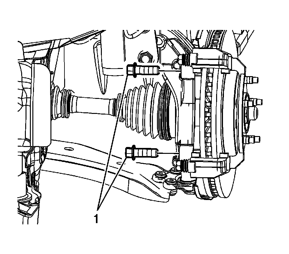 3. Hold the brake caliper guide pin stationary and remove the brake caliper guide pin bolts (1).