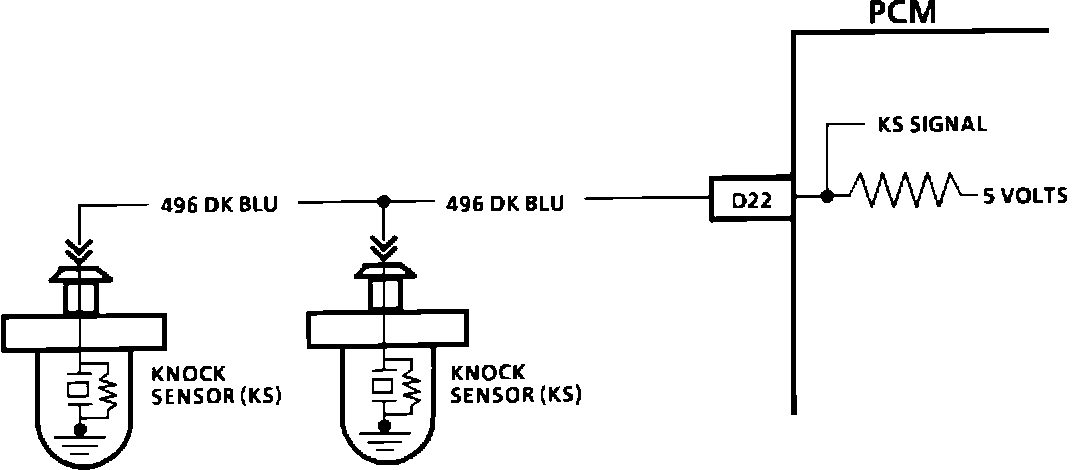 The knock sensors produce an AC voltage which is sent to the knock sensor module. The amount of AC voltage produced by the sensors depend upon the amount of knock. This signal is input to the PCM where it adjusts the Ignition Control (IC) to reduce spark knocking.
