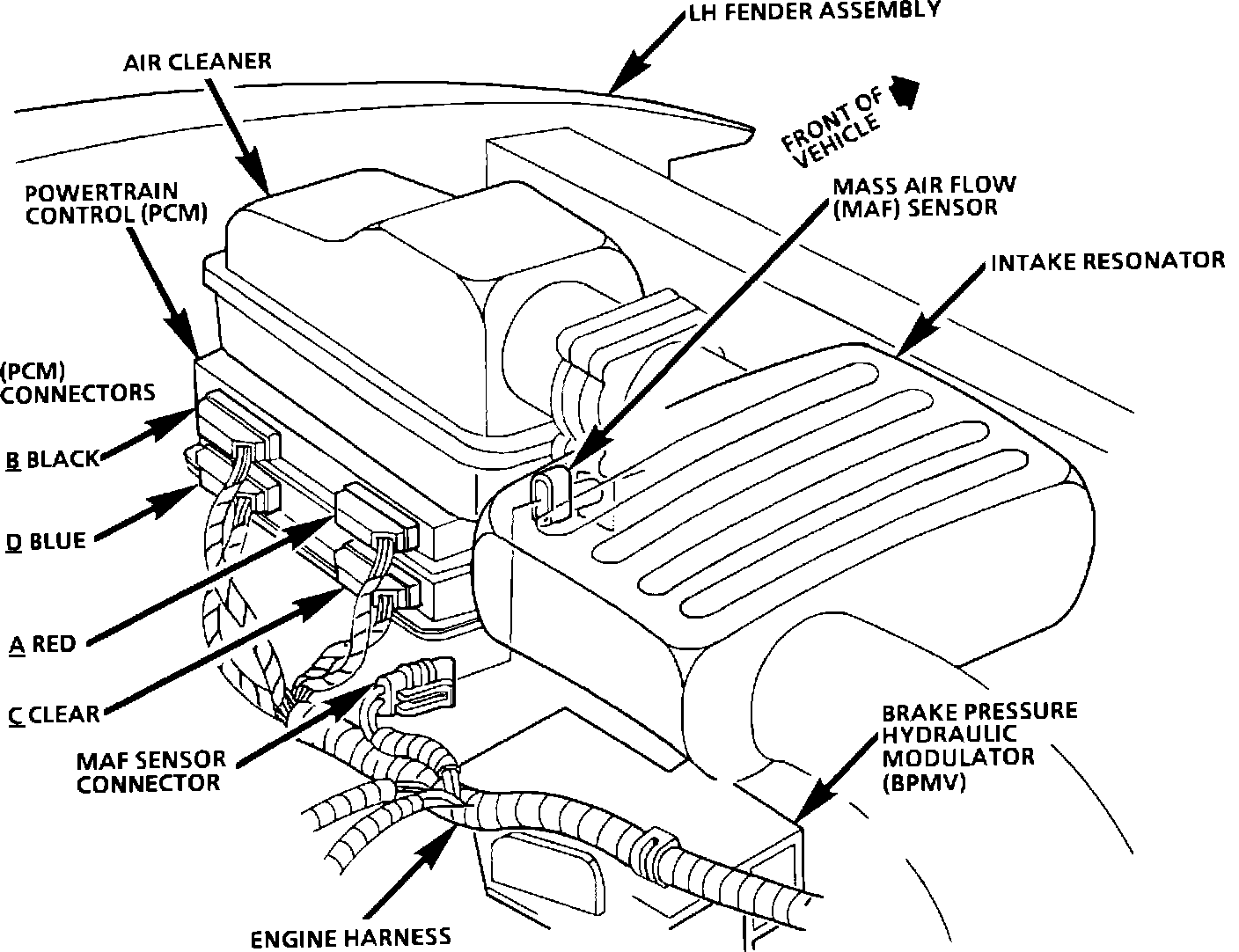The powertrain control module is located in the engine compartment, forward of the left wheelhouse, under the air cleaner.