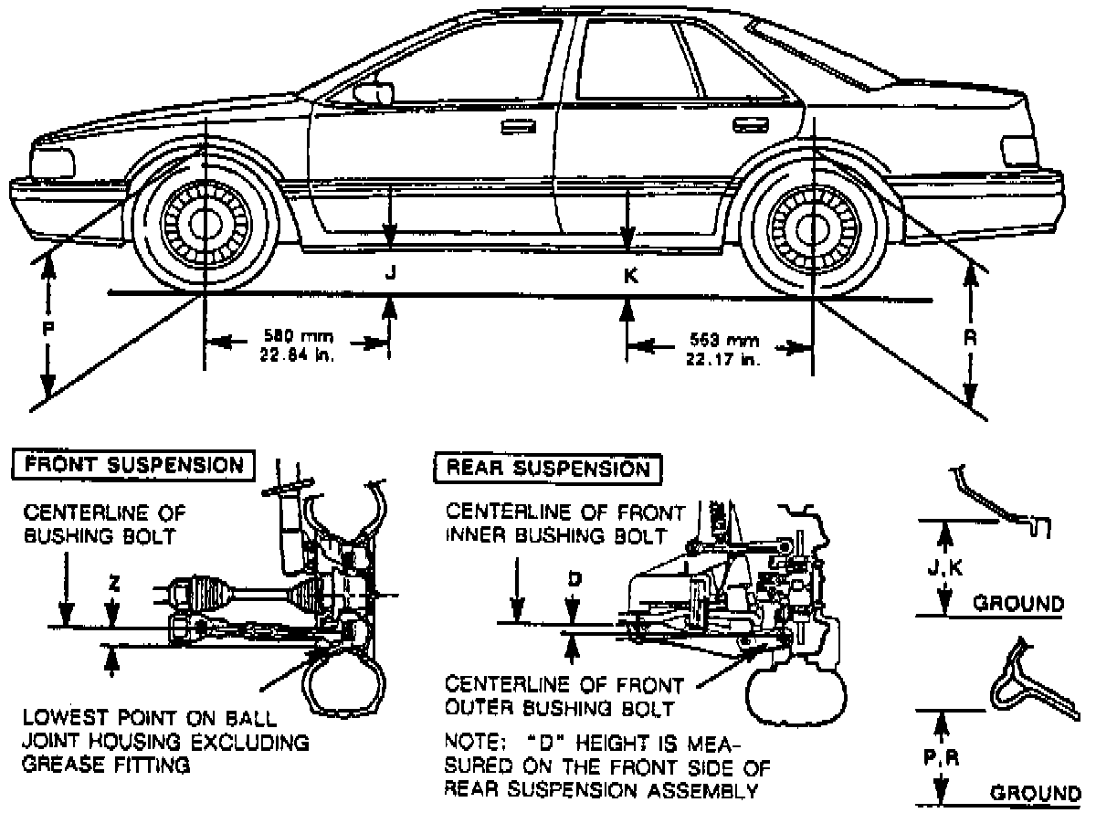 Refer to Fig. 6, for ride height measurements and specifications below. When checking ride height measurements, fuel tank should be full, tires should be at correct pressure, front seat should be rearward position, truck should be empty except for spare tire and jack and vehicle should be on level ground. If fuel tank is not full, add weight to trunk to compensate for amount of fuel vehicle is below the full level. Prior to checking ride height, lift front bumper upward approximately 1.5. inches and gently release (3 times), then check front ride height. Push front bumper downward approximately 1.5 inches and gently release (3 times), then recheck front ride height. Average both readings to determine vehicle ride height. Check rear ride height in same manner, lifting and pushing rear bumper.
