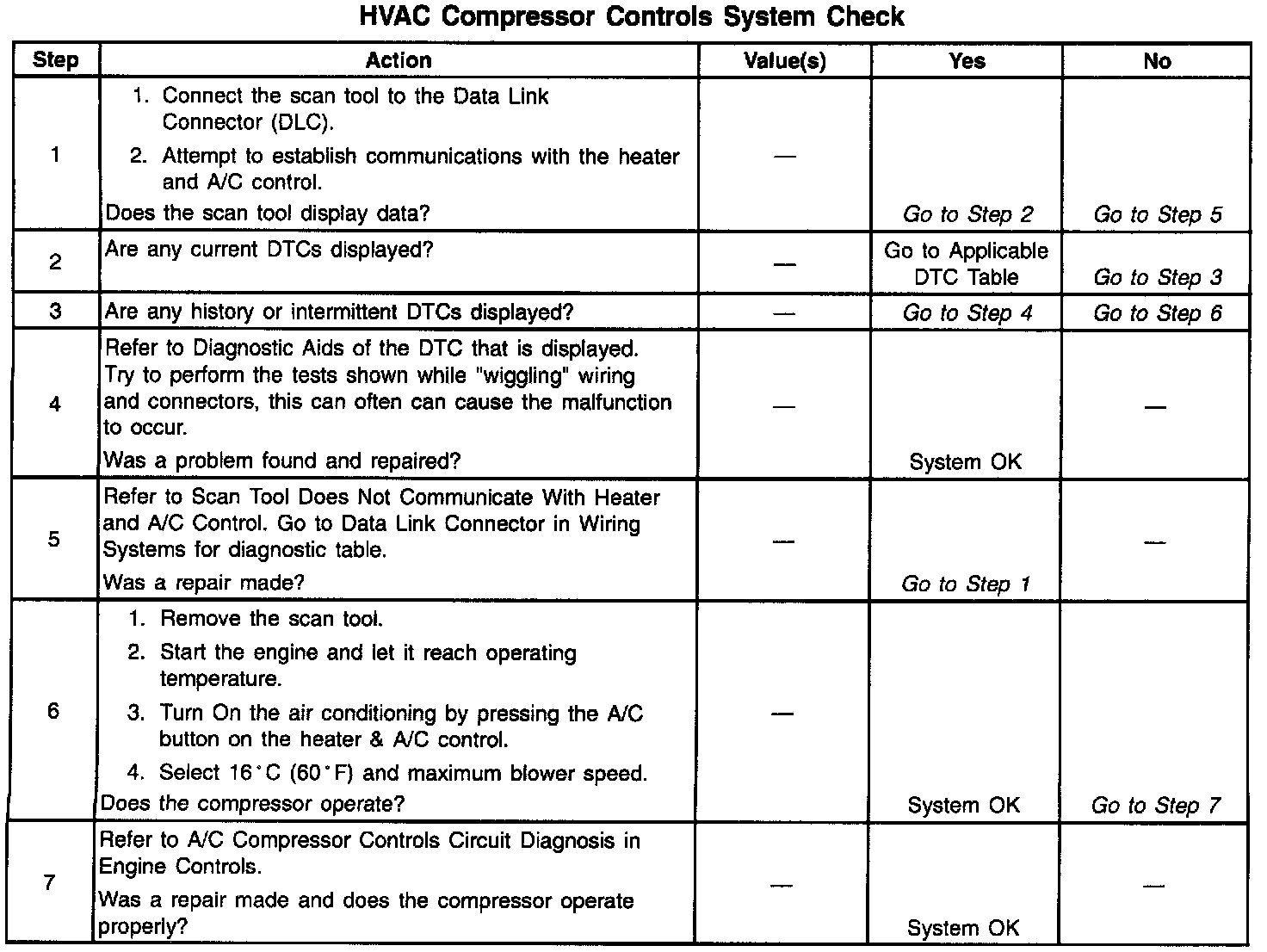 The Compressor Controls System Check is an organized approach to identify problems associated with the heater & A/C control. This check must be the starting point for any compressor controls complaint, and will direct you to the next logical step in diagnosing the complaint. The heater and A/C control is a very reliable component and is not likely the cause of the malfunction. Most system complaints are linked to faulty wiring and connectors, and occasionally to components. Understanding the computer system and using the tables correctly will reduce diagnostic time and prevent unnecessary parts replacement.