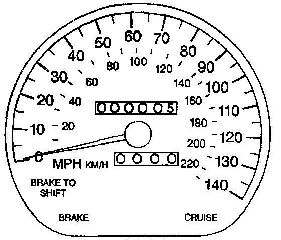 The analog speedometer in this vehicle is controlled by a steeper motor measuring mechanism actuated by a stepper motor driver. The input to the speedometer is supplied exclusively by the Electronic Brake Traction Control Module (EBTCM). The maximum display readout range is 185 degrees of pointer sweep. With power applied to the speedometer the speedometer pointer is moved back to the internal stop for zero point recognition (restart). Without power to the speedometer the pointer is not moved back to the zero position. The speedometer display accuracy tolerance is accurate to within ±2.0 degrees of needle sweep.