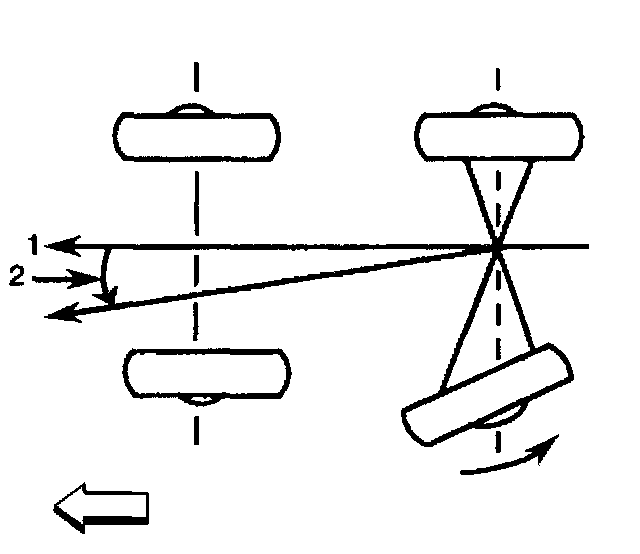 The front wheels aim or steer the vehicle. The rear wheels control tracking. The tracking action is relative to the thrust angle (2). Thrust angle (2) is defined as the path that the rear wheels will take. The thrust angle (2) should be aligned with the body centerline (1).