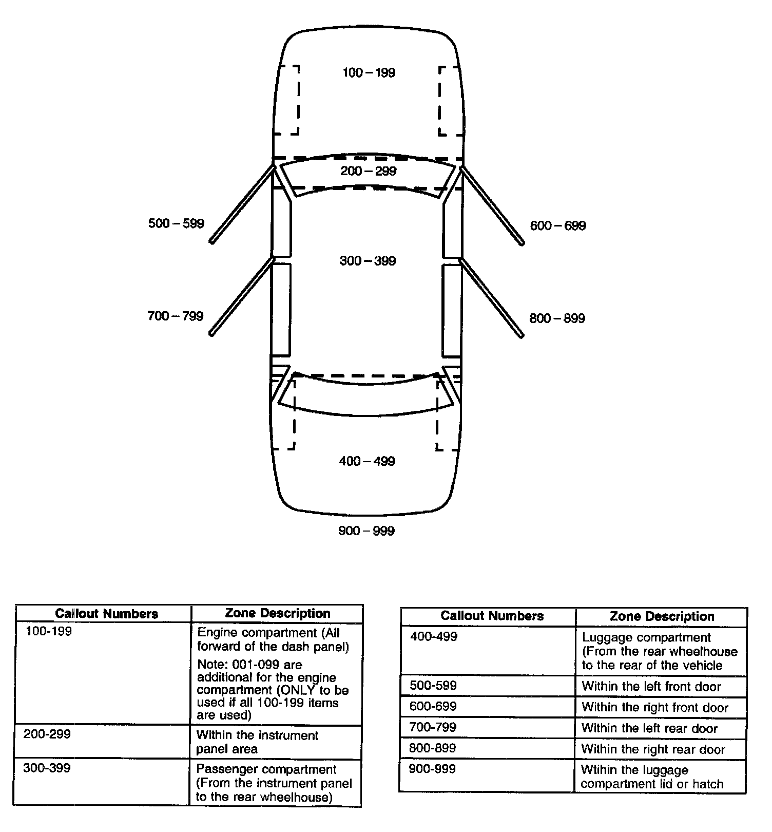 All grounds, in-line connectors, pass-through grommets, and splices have identifying numbers that correspond to where they are located in the vehicle. The table explains the numbering system.