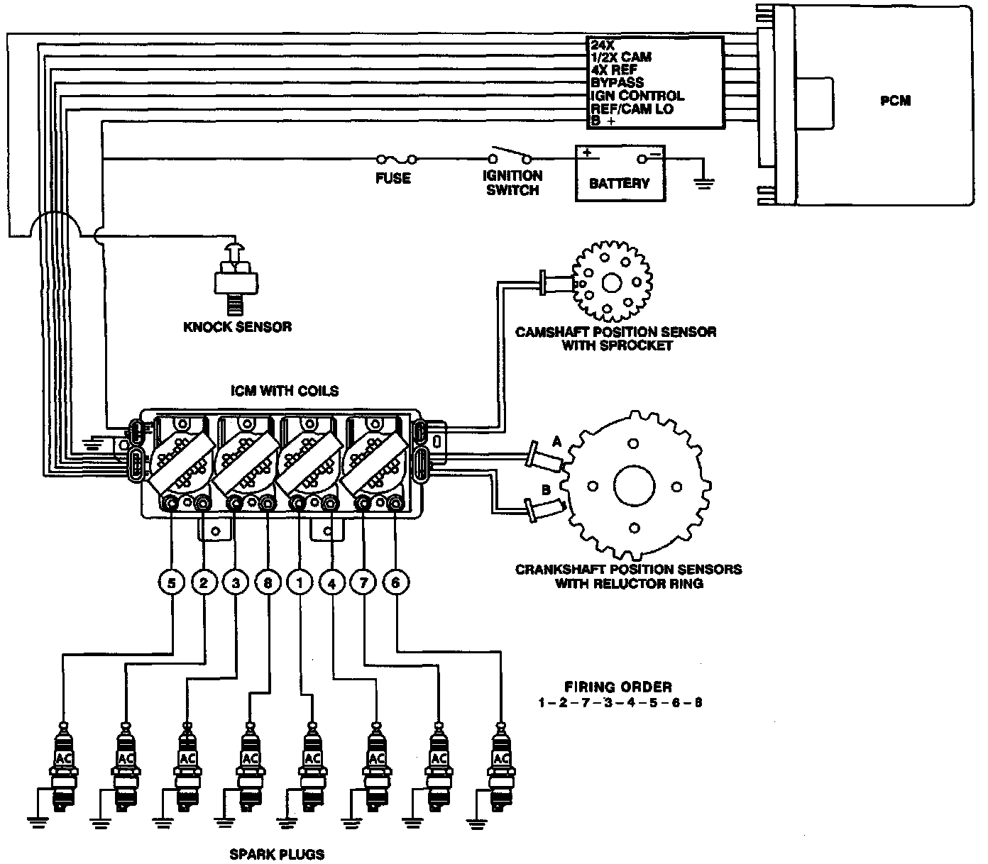 The Ignition Control System for this Powertrain controls fuel combustion by providing a spark to ignite the compressed air/fuel mixture in each cylinder at the correct time. The ignition control system has several advantages over a mechanical distributor ignition system.