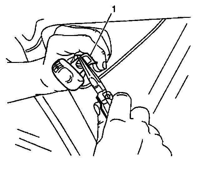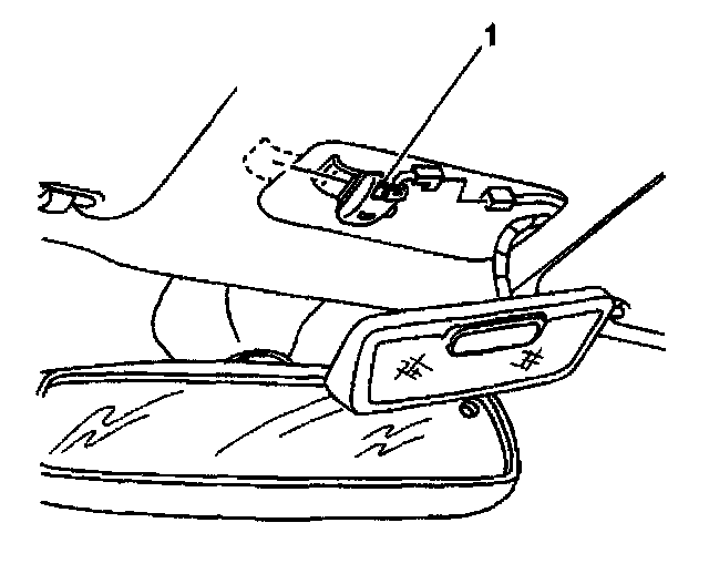4. Install and connect the microphone (1). Locate the two-way connector in the headliner. This connector will have red tape on the wire as an indicator. Install the microphone on the driver side headliner cut-out for the map light housing.