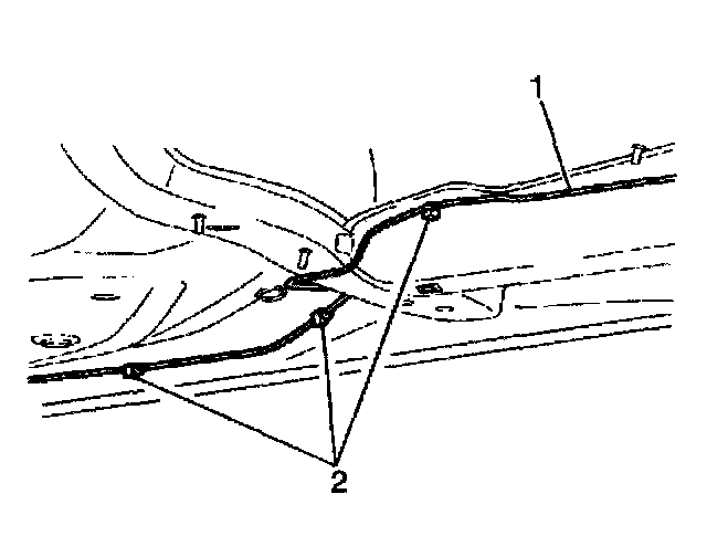 1. Install the intermediate brake pipe (1) to the underbody clips (2).