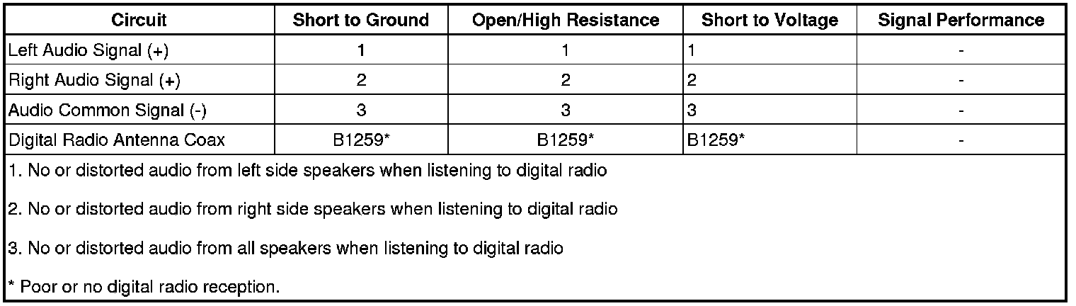 • If either side of the vehicle is not producing sound or the sound produced is distorted, refer to Digital Radio Signal Circuit Malfunction.