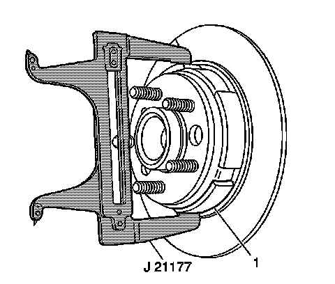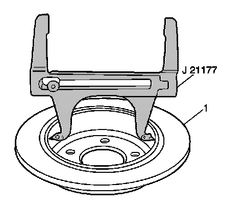 10. Position the J 21177-A over the park brake shoe (1) at the widest point.