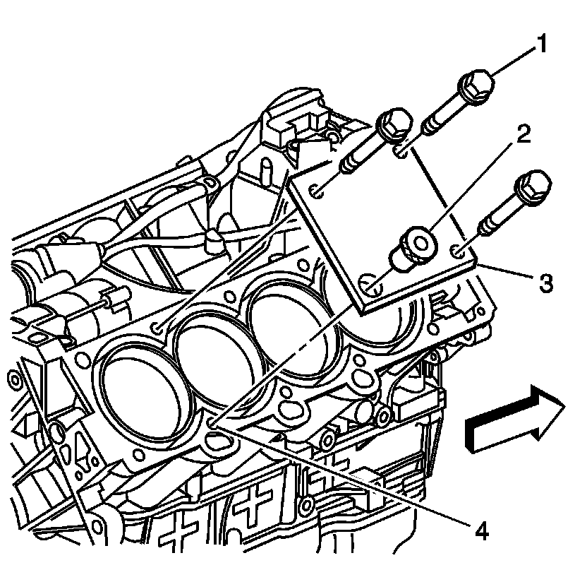 1. Position the fixture plate (3) with the bushing (2), installed over the crankshaft main cap bolt hole to be repaired.