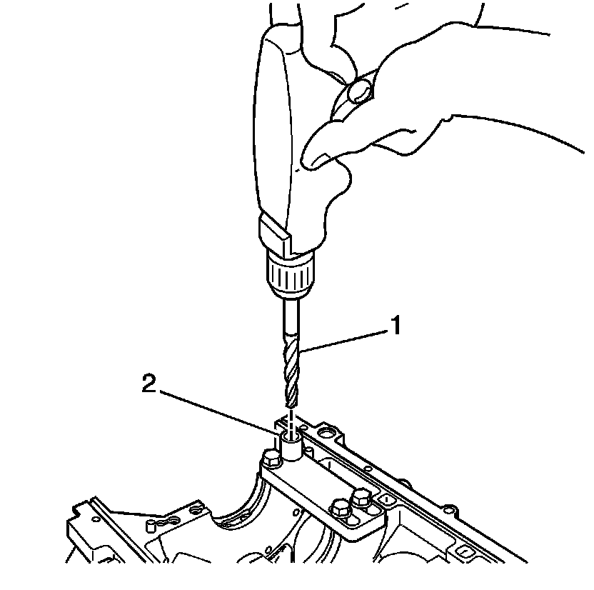 * Drill the crankshaft main bolt hole until the mark (1) on the drill aligns with the top of the drill bushing (2).