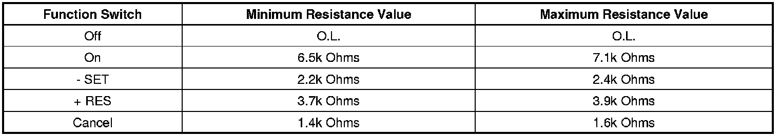 2. Cruise control switch ON, measure the resistance between terminal 1 and terminal 2 while individually activation and holding each cruise control function switch and compare the resistance reading to the values in the table below.
