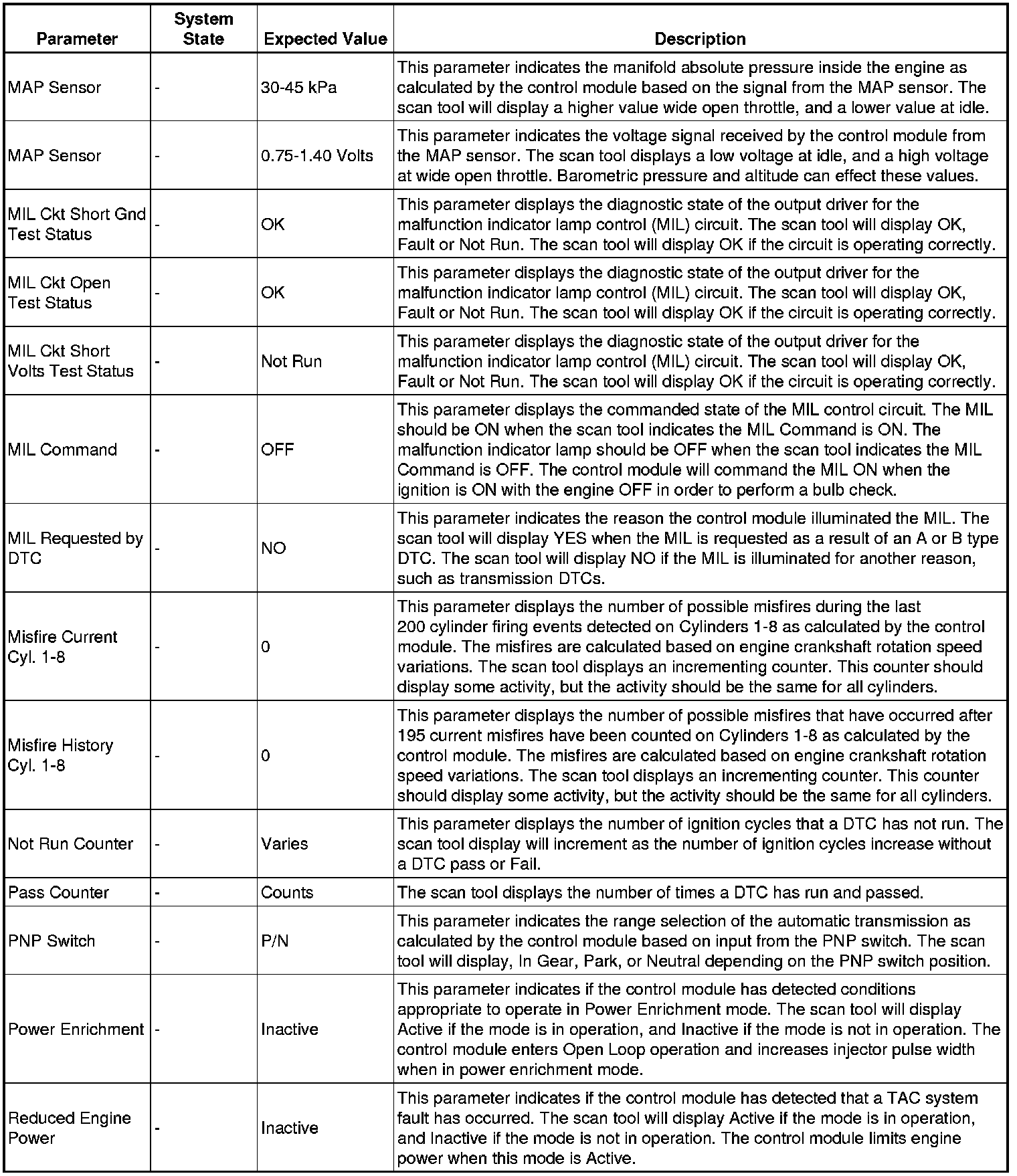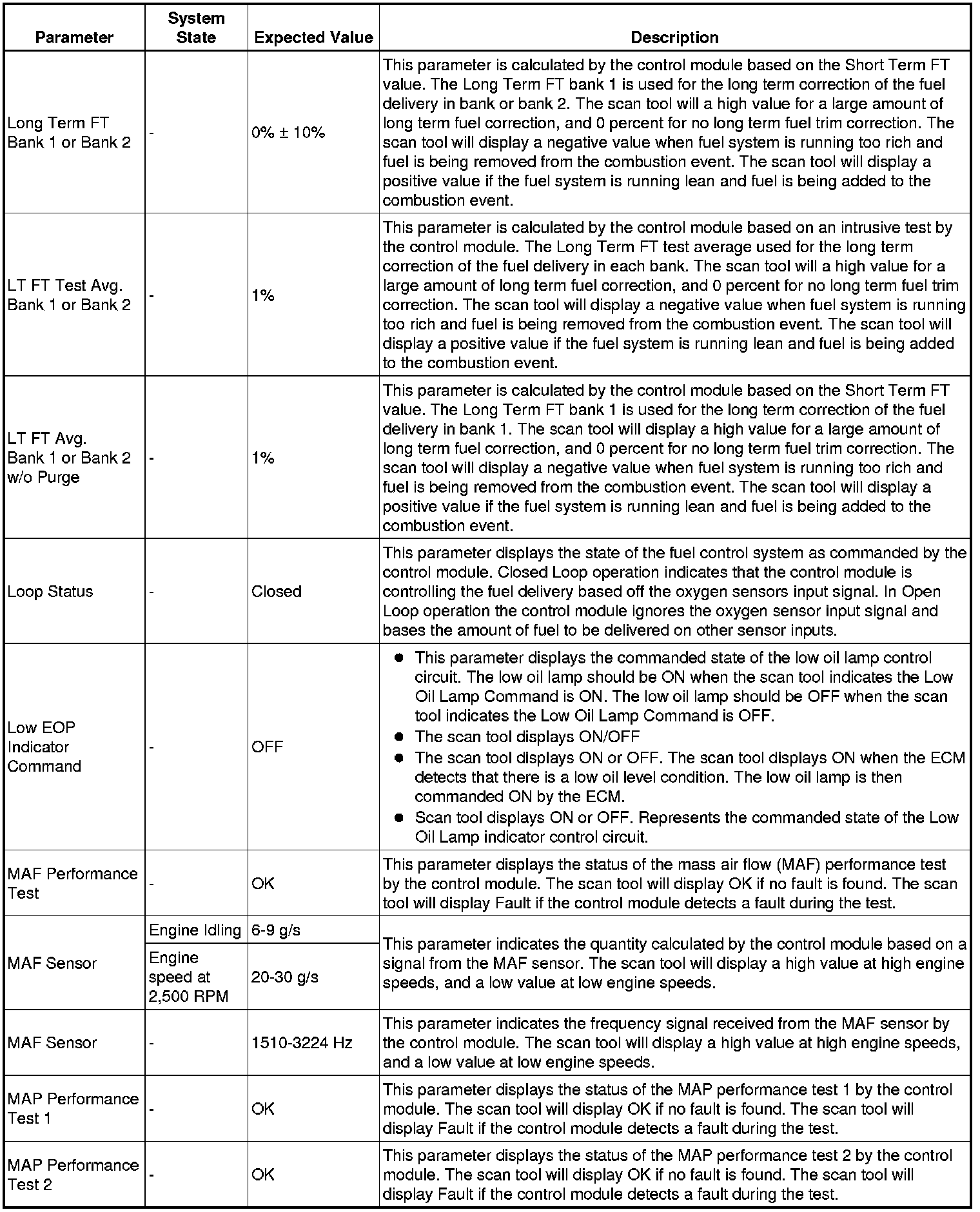 The scan tool values from a properly running engine may be used for comparison with the engine you are diagnosing. The engine scan tool data list represents values that would be seen on a normally running engine.