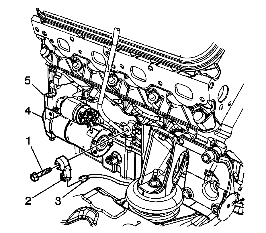 5. Install the starter assembly (4), ONLY IF REMOVED. Refer to Starter Replacement (LF1/LLT) (Service and Repair)Starter Replacement (LSA) (Service and Repair).