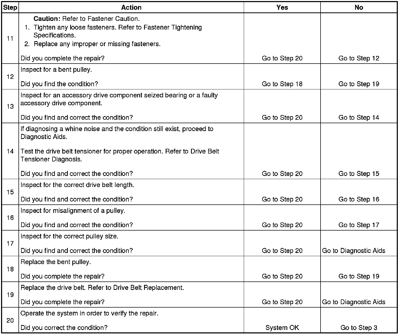 * If the noise is intermittent, verify the accessory drive components by varying their loads making sure they are operated to their maximum capacity. An overcharged A/C system, power steering system with a pinched hose or wrong fluid, or a generator failing are suggested items to inspect.