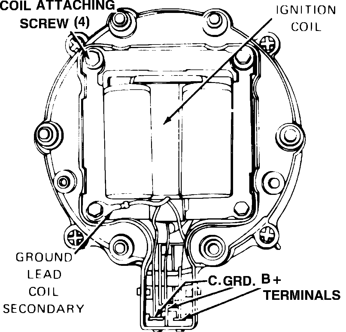 b. Disconnect coil high tension lead, then remove coil retaining bolts and the coil.