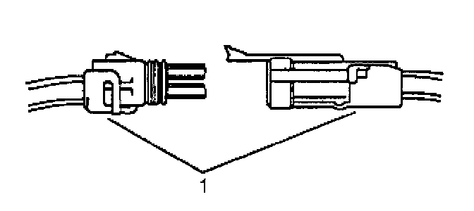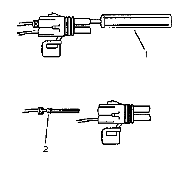 4. Insert the Weather Pack(R) terminal removal tool into the front (mating end) of the connector cavity until it rests on the cavity shoulder (1).