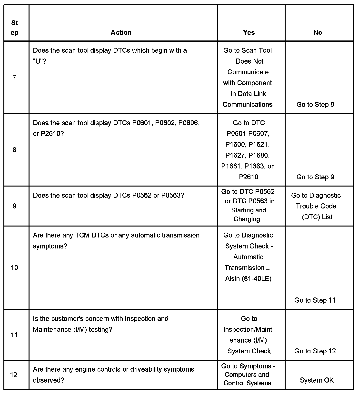 The Diagnostic System Check-Computers and Control Systems is an organized approach to identifying a condition that is created by a malfunction in the engine control system. The Diagnostic System Check must be the starting point for any driveability concern. The Diagnostic System Check directs the service technician to the next logical step in order to diagnose the concern. Understanding and correctly using the diagnostic table reduces diagnostic time and prevents the replacement of good parts.