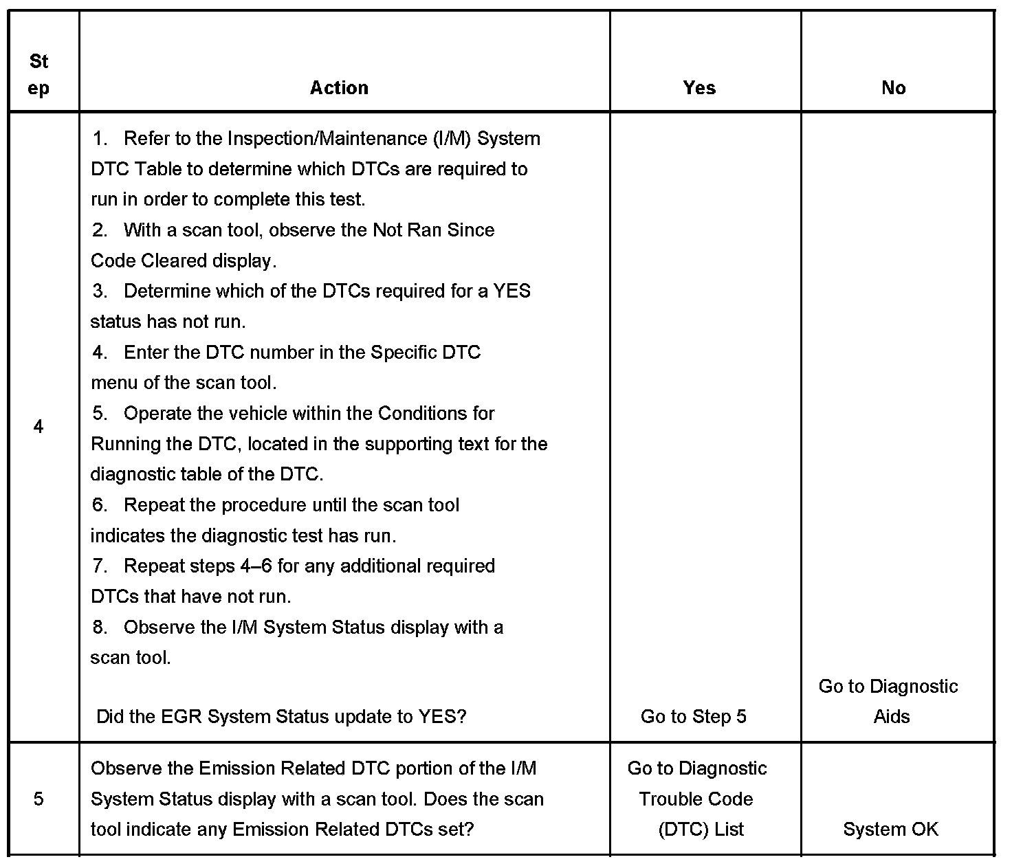 The purpose of this test is to satisfy the enable criteria necessary to execute inspection/maintenance (I/M) readiness diagnostics for the exhaust gas recirculation (EGR) system. The test may be used to set the I/M System Status indicators to YES. The I/M System Status display on the scan tool provides an indication of whether the control module has completed the required tests. The I/M System Status does not indicate that the tests have passed or failed. When all of the diagnostics for a specific system have run and passed, the I/M System Status will update to YES. If a test for a specific system has failed, the I/M System Status will update to YES, indicating a determination was made even if all of the other tests for that system have not run.