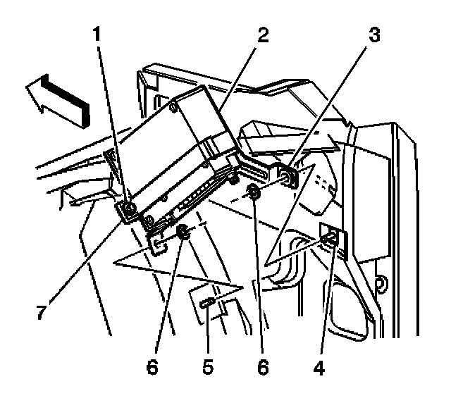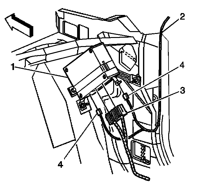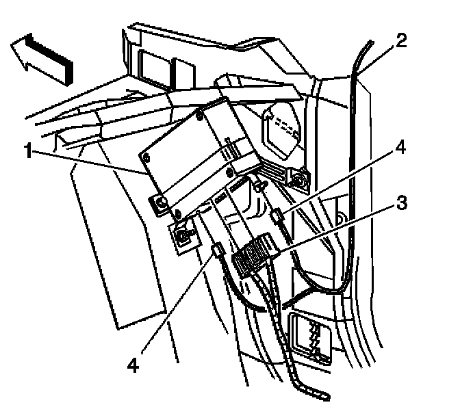 1. Install the OnStar(R) module (2) thorough the opening for the passenger inflator module.