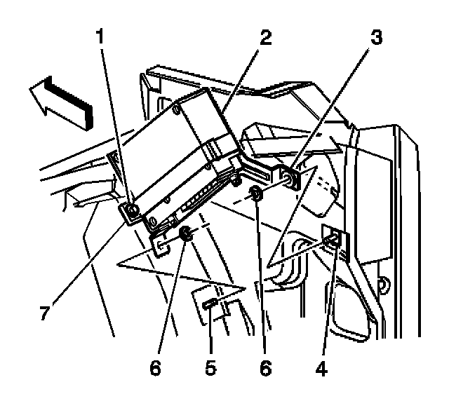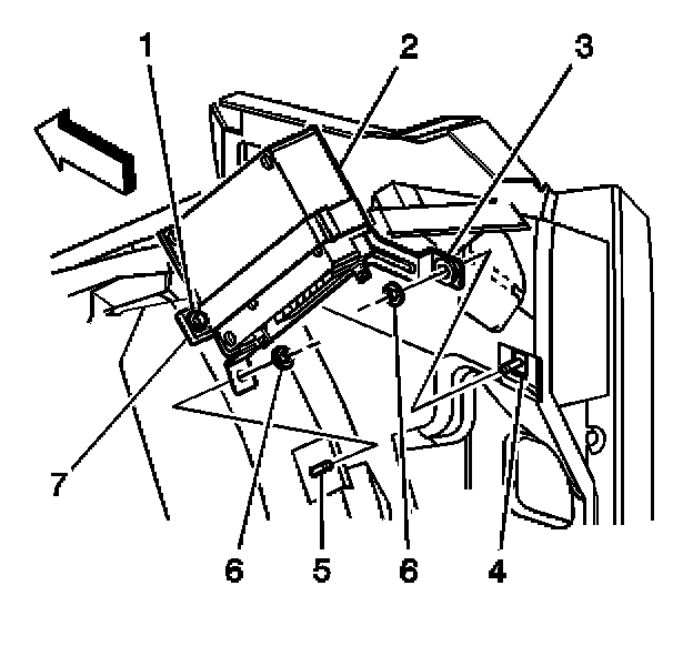 9. Pull downward on the back of the I/P compartment to remove the OnStar(R) module (2) from the bracket (3).