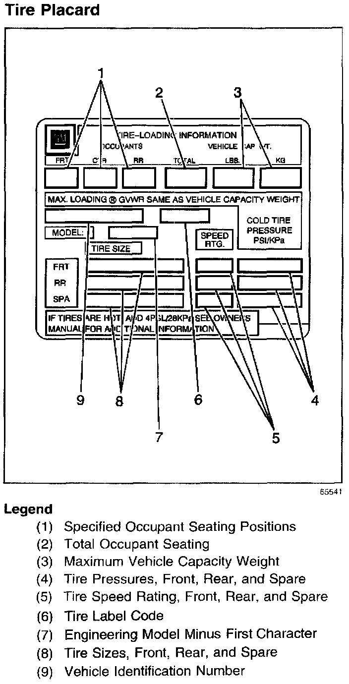TIRE PLACARDThe Tire Placard is permanently located on the edge of the driver's door. Refer to the placard in order to obtain the following information: