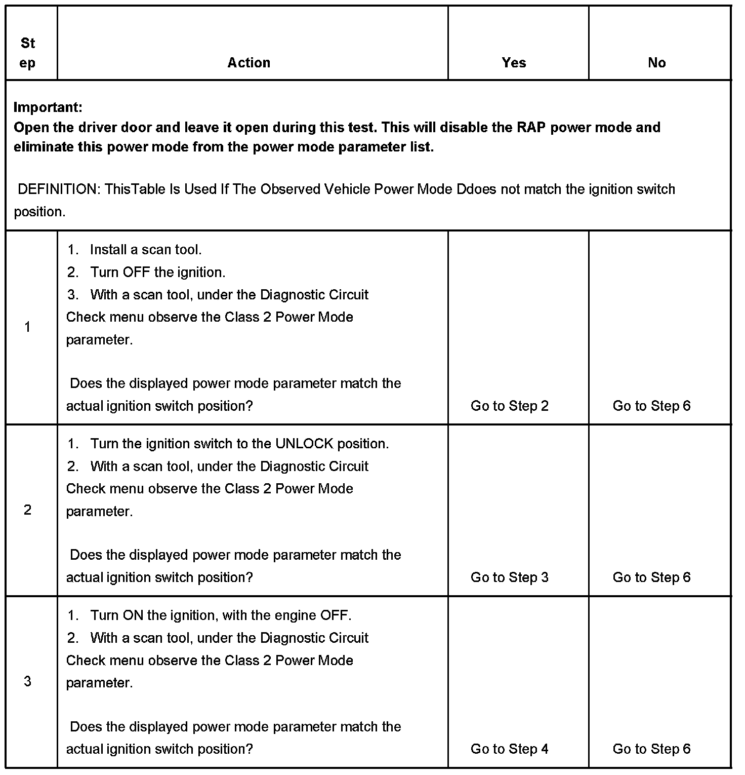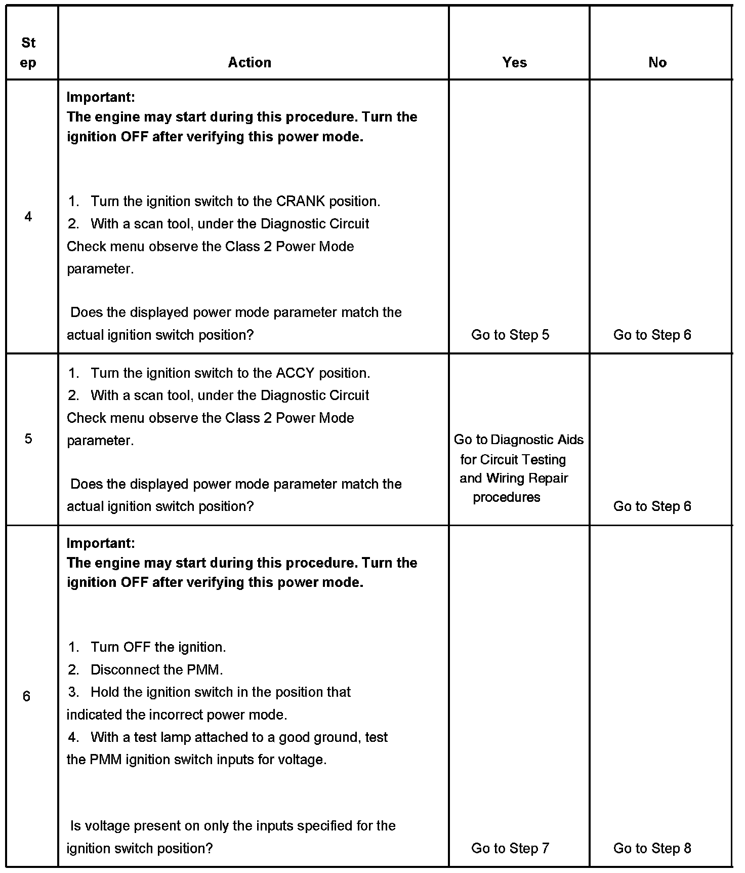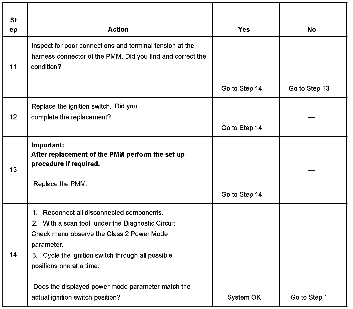 Normal vehicle class 2 communications and module operations will not begin until the system power mode has been identified. Discrete wires from the ignition switch contacts are monitored by the power mode master, PMM module in order to determine the correct power mode. The PMM communicates the system power mode to all class 2 modules on the class 2 serial data line. Refer to Body Control System Description and Operation to identify which module is the PMM and the applicable power mode look up table.