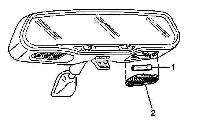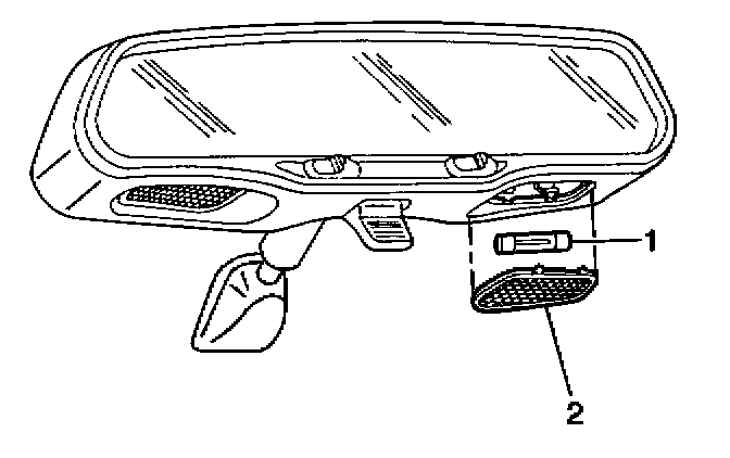 1. Using a small flat-bladed tool, carefully pry at the rear edge, furthest from the windshield, of the lamp lens (2) to release the retaining tabs, then remove the lens from the rearview mirror.