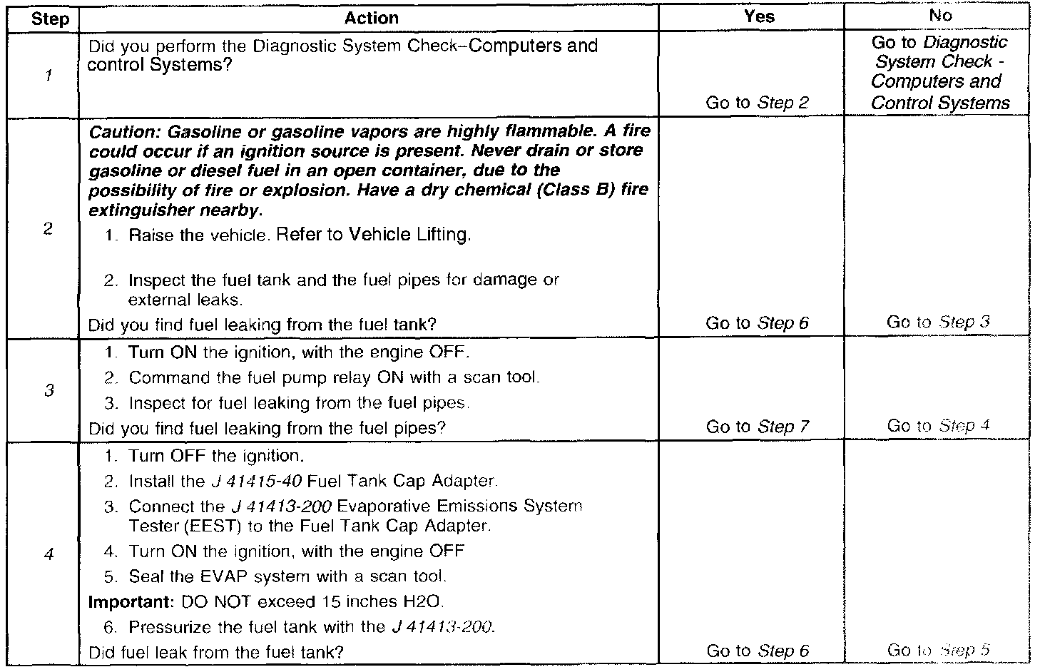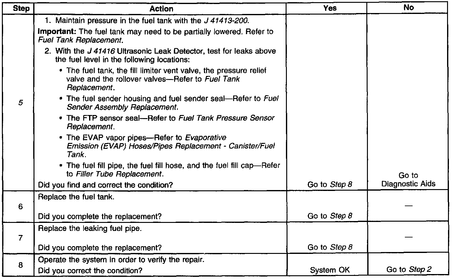 The fuel lank leak test is used to locate any fuel or fuel vapor escaping the fuel tank area. Fuel vapors escaping above the fuel level will be detected when the evaporative emission (EVAP) diagnostics complete one test cycle. The malfunction indicator lamp (MIL) will illuminate after the EVAP diagnostics complete two test cycles.