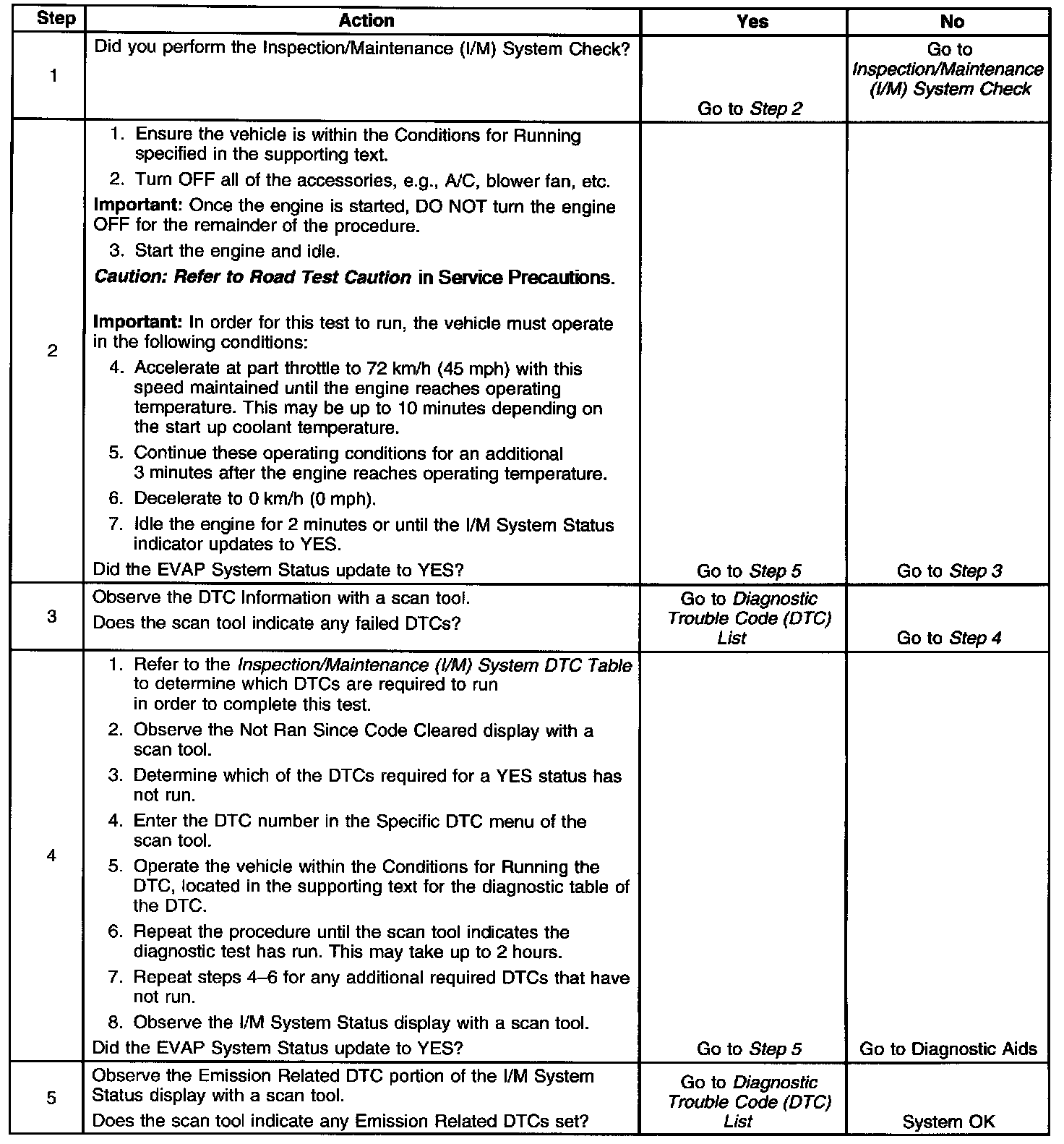 The purpose of this test is to satisfy the enable criteria necessary to execute I/M readiness diagnostics for the evaporative emission (EVAP) system. The test may be used to set the I/M System Status indicators to YES. The I/M System Status Display on the scan tool provides an indication of whether the control module has completed the required tests. The I/M System Status does not indicate that the tests have passed or failed. When all of the diagnostics for a specific system have run and passed the I/M System Status will update to YES. If a test for a specific system has failed, the I/M System Status will update to YES indicating a determination was made, even if all of the other tests for that system have not run. Performing a visual inspection prior to running the EVAP test may prevent having to repeat the test. A failed or aborted test will require the vehicle to cool down in order to meet the enable criteria to run another test.