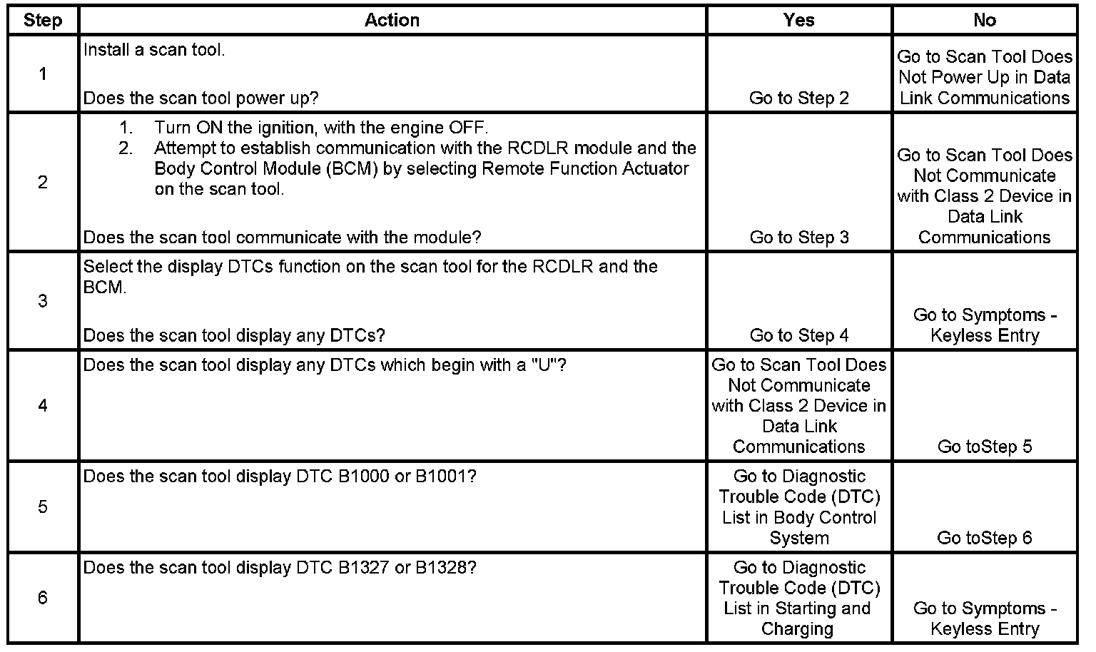 6. At this point you have determined all DTCs which could affect the keyless entry system. Refer to Symptoms - Keyless Entry for further keyless entry diagnosis. Any other codes displayed from the listed modules do not apply to the keyless entry system and should be diagnosed in the applicable section. Symptom Related Diagnostic Procedures