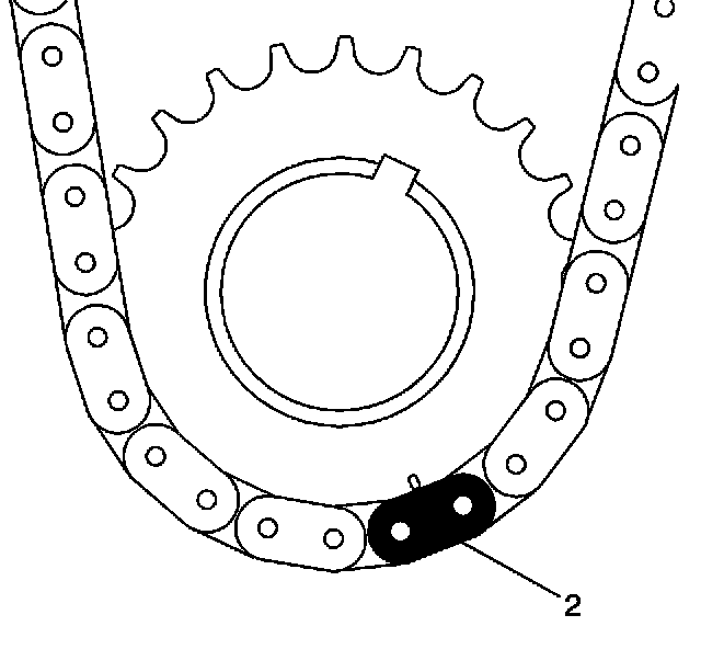 Rotate the engine until the crankshaft sprocket mark aligns with the matching colored link (2) at the 5 o'clock position.