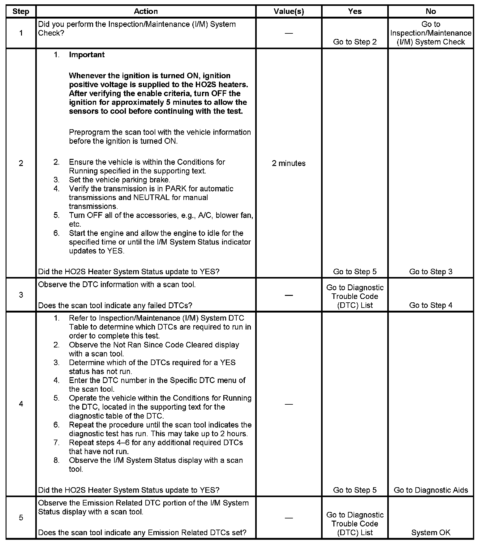 The purpose of this test is to satisfy the enable criteria necessary to execute I/M readiness diagnostics for the heated oxygen sensor (HO2S) heater system. The test may be used to set the I/M System Status to YES. The I/M System Status Display on the scan tool provides an indication of whether the control module has completed the required tests. The I/M System Status does not indicate that the tests have passed or failed. When all of the diagnostics for a specific system have run and passed the I/M System Status will update to YES. If a test for a specific system has failed, the I/M System Status will update to YES, indicating a determination was made, even if all of the other tests for that system have not run.