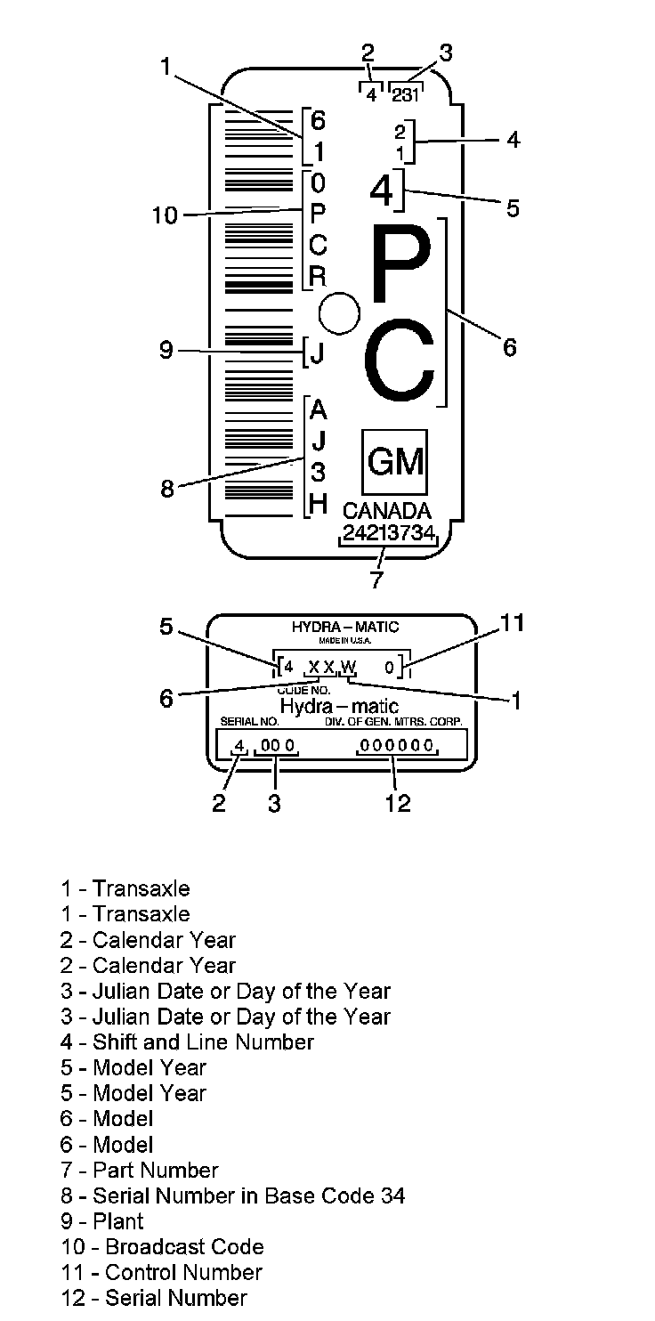 The information on the nameplate assists the technician in servicing the transmission and ordering replacement parts from a GM Parts Catalog.