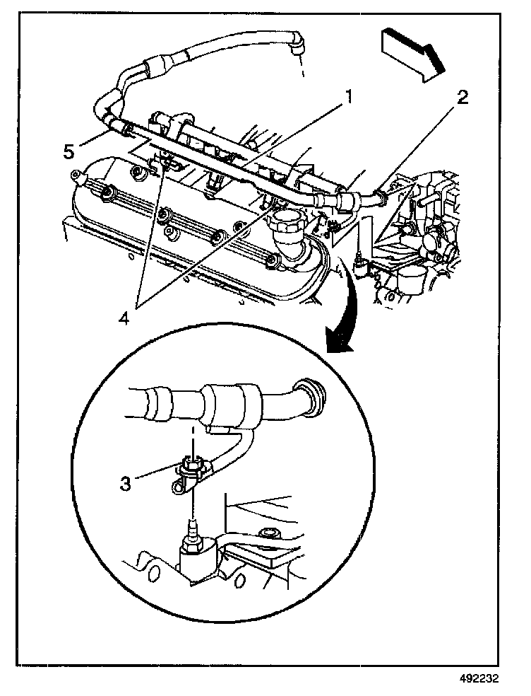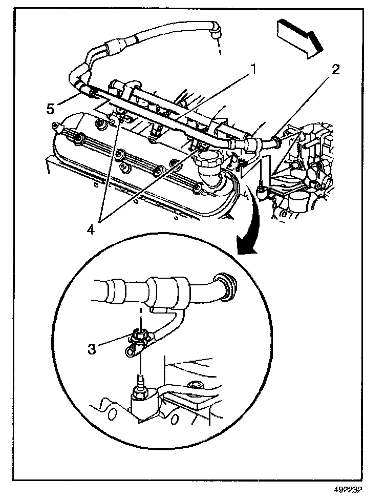 6. Release the PCV hose assembly from the mounting brackets (4).
