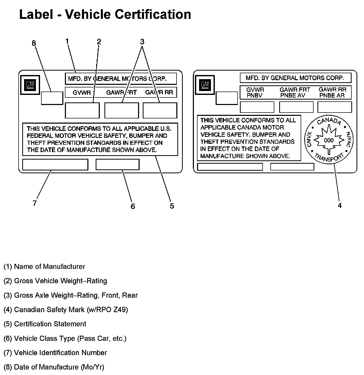 LABEL - VEHICLE CERTIFICATIONThe vehicle certification label is permanently located on the edge of the driver's door. Refer to the label in order to obtain the following information: